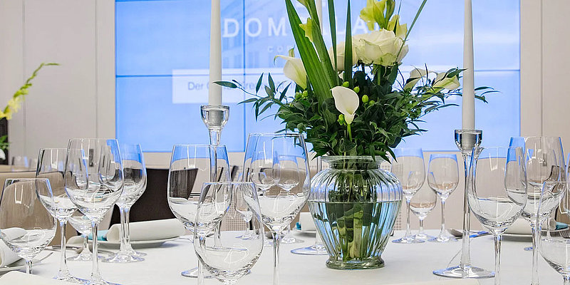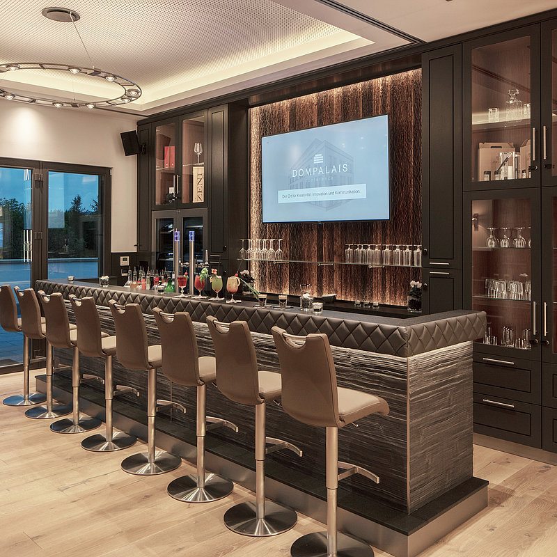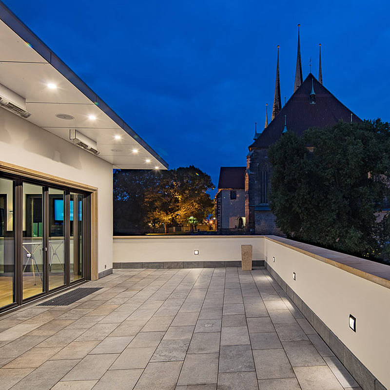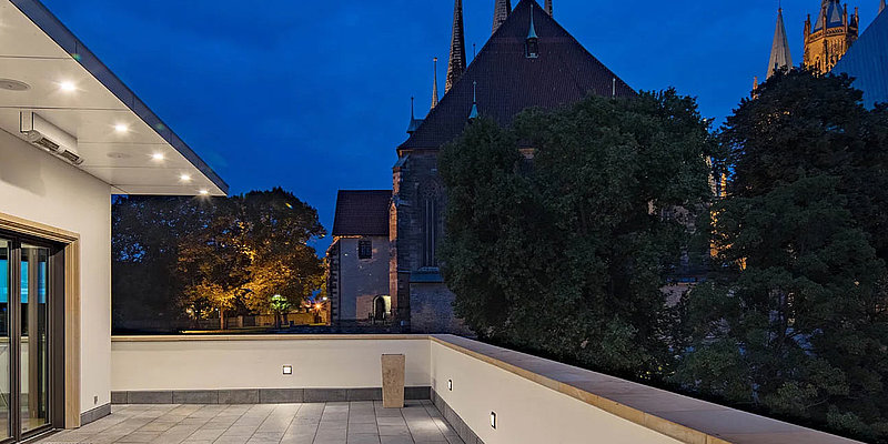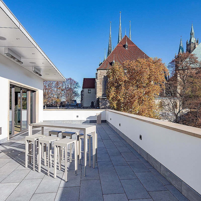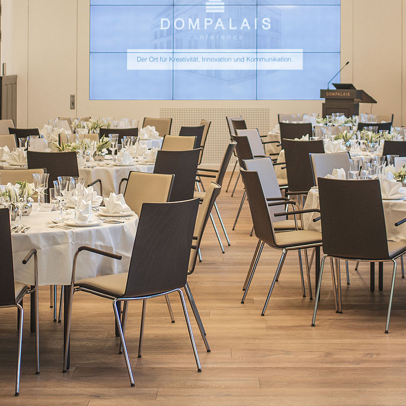 Mit direktem Blick auf das Wahrzeichen der Thüringer Landeshauptstadt Erfurt überzeugt das Dompalais mit exklusivem Ambiente: stilvolle Konferenzräume mit modernster Ausstattung und hochwertiger Veranstaltungstechnik. Mitten im Zentrum der Stadt gelegen, ist das Dompalais der Ort für außergewöhnliche Events mit repräsentativem Charakter. Dank optimaler Verkehrsanbindung ist das Dompalais zu Fuß, mit öffentlichen Nahverkehrsmitteln, mit PKW oder überregional durch den Flughafen Erfurt-Weimar zu erreichen.